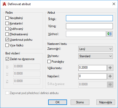 Určuje umístění atributu. Zadejte hodnoty souřadnic nebo klikněte na možnost Zadat na obrazovce a pomocí ukazovacího zařízení určete umístění atributu vzhledem k jiným objektům.