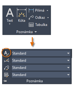 Stejně jako řada dalších funkcí poznámek, nabízí víceřádkový text mnoho možností nastavení. Tato nastavení můžete uložit pomocí příkazu PÍSMO jako styl textu. Přístup ke stylům textu, které jste uložili, pak můžete získat kliknutím na rozevírací šipku na panelu Poznámka. Aktuální styl textu je zobrazen v horní části rozevíracího seznamu.