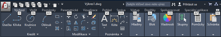 Výběr možností v nabídkách, na panelu nástrojů Rychlý přístup a v pásu karet lze provádět stisky kláves namísto ukazovacím zařízením. Chcete-li zjistit, které kláves jsou v aktuálním pracovním prostoru k dispozici, stiskněte klávesu Alt.
