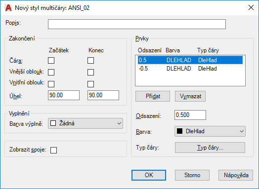 Přidá do stylu multičáry nový prvek. Není k dispozici, dokud nezvolíte barvu nebo styl čáry z jiného stylu křivky, než je STANDARDNÍ.