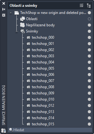 Vyhledávání podle názvu mračna bodů, oblasti nebo souboru snímku.
