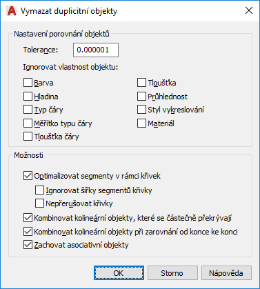 Pokud je tato možnost vybrána, jsou zkontrolovány jednotlivé segmenty úseček a oblouků v rámci vybrané křivky. Duplicitní vrcholy a segmenty jsou odstraněny.