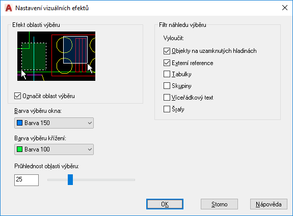 - Určuje průhlednost oblasti výběru při výběru v okně nebo křížovém výběru. (systémová proměnná SELECTIONAREAOPACITY)