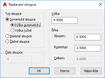 Zobrazí a určí šířku sloupce a rozestupu. Rozteč sloupců je pětinásobkem výchozí výšky textu.