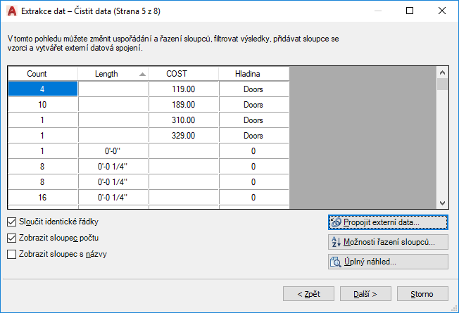 Po výběru vlastností dveří se extrahovaná data zobrazí v průvodci ve sloupcích. Informace v těchto sloupcích můžete uspořádat a upřesnit a naformátovat je určením stylu tabulky nebo použitím existující tabulky jako šablony.
