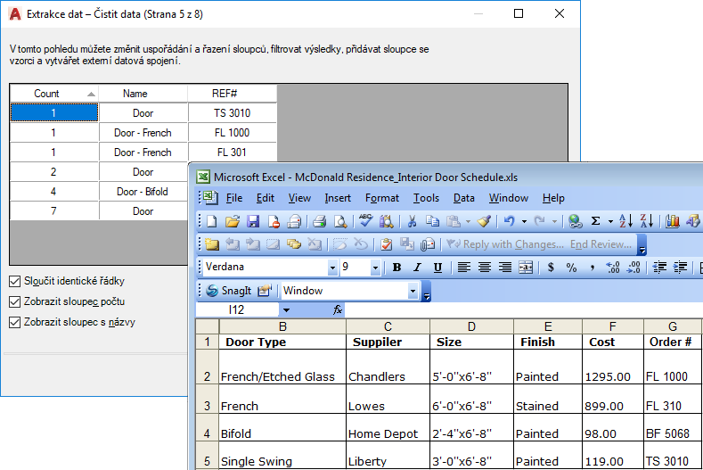 Informace uložené v tabulce aplikace Excel mohou být spojeny s kombinovány a extrahovanými daty výkresu (data vlastností objektu). Budeme pokračovat se stejným příkladem jako nahoře: máte další informace o dveřích ve výkresu uložené v tabulce aplikace Excel (informace o dodavateli a nákladech). Vyberete v tabulce sloupce dodavatele a nákladů a sloučíte je s ostatními daty v extrakci dat.