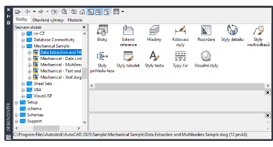 Pomocí stromového zobrazení vlevo lze procházet zdroje obsahu a zobrazovat obsah v oblasti pro obsah vpravo. Z oblasti pro obsah můžete přidávat položky do výkresu nebo do palety nástrojů. Pro vybrané výkresy, bloky, šrafovací vzory nebo externí reference se zobrazuje náhled nebo popis.