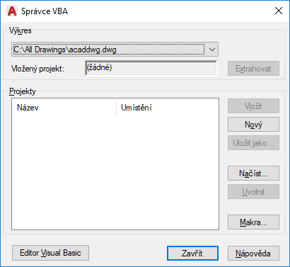 Editor Visual Basic použijte k editování programu, formulářů a referencí pro jakýkoliv načtený globální projekt VBA nebo jakýkoliv vložený projekt VBA v aktuálním výkresu. V Editoru Visual Basic můžete projekty odlaďovat a spouštět.