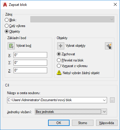 Po jejich uložení převede vybraný objekt nebo objekty na blok v aktuálním výkresu.