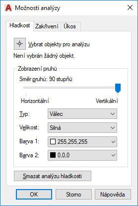 Karty na dialogu obsahují nastavení k úpravě všech tří typů analýzy těles a povrchů: Zebra analýzy (spojitosti), zakřivení a úhlu zkosení.