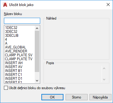 Uloží definici bloku jako výkresový soubor. Výběr předem existujícího výkresového souboru přepíše uložený soubor. Ve výchozím nastavení bude vybraný název bloku považován za název výkresového souboru.