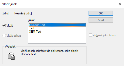 Vloží obrázek ikony aplikace namísto dat. Dvojitým kliknutím na ikonu lze data zobrazit nebo editovat.