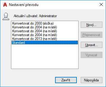 Zobrazí dialog Upravit nastavení převodu, ve kterém je možné určit možnosti pro vybraný převod výkresů.