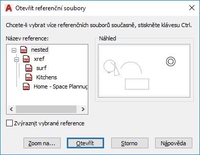 Dialog Otevřít referenční soubory zobrazí referenční strom se všemi vnořenými externími referencemi. Zdrojový soubor pro vybrané externí reference se otevře v samostatném okně výkresu, kde lze výkres upravit, uložit a poté zavřít.