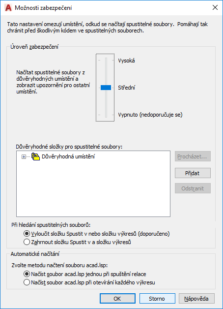 Řídí omezení zabezpečení pro spuštění spustitelných souborů v aplikaci AutoCAD.