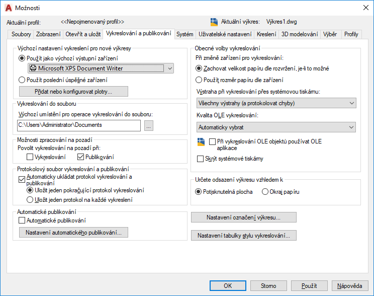 Určuje, zda se výkresy automaticky publikují do souborů DWF, DWFx nebo PDF. Můžete také určovat možnosti automatického publikování.