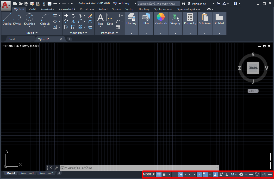 Na stavovém řádku se zobrazují umístění kurzoru, kreslicí nástroje a nástroje, které ovlivňují prostředí výkresu.