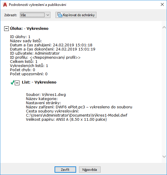 Zobrazí informace o dokončených úlohách vykreslování a publikace a listech těchto úloh.