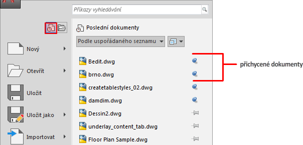 Soubor lze uchovat v seznamu bez ohledu na soubory uložené později, a to kliknutím na ikonu připínáčku vpravo od názvu souboru. Soubor se zobrazuje na posledním místě seznamu, dokud připnutí nezrušíte.