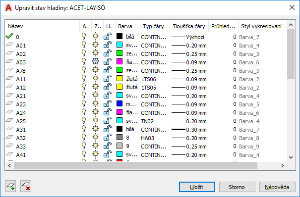 Zobrazí všechny hladiny a jejich vlastnosti, které jsou uloženy ve vybraném stavu hladiny.