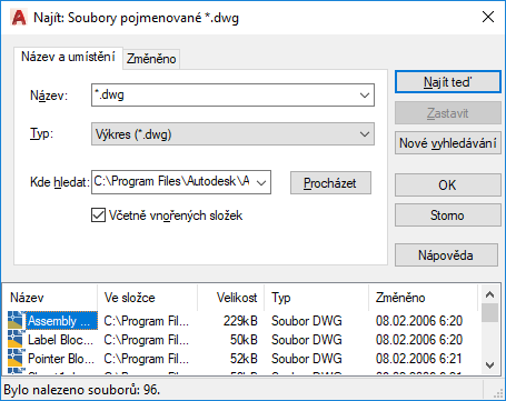 Typ souborů k vyhledávání je závislý na poli Typ, takže v poli Pojmenované nemusíte zadávat příponu souboru. Například chcete-li najít soubor budova102.dvg, zadejte budova* a nastavte Typ výkresu (*.dvg).