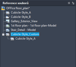 Horní úroveň stromového zobrazení zobrazuje vždy aktuální výkres. Soubory s referencemi se zobrazují na nižší úrovni. Soubory s referencemi, které obsahují vlastní vnořené referenční soubory, lze otevírat tak, aby se zobrazily nižší úrovně. Při provádění výběrů ve stromovém zobrazení nelze současně vybírat více než jeden referenční soubor.