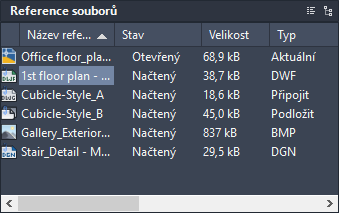 Sloupec Název reference zobrazuje jako první záznam vždy aktuální výkres, po kterém následují dodatečně připojené soubory, které jsou uvedeny v pořadí, v jakém byly připojeny.