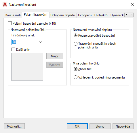 Pokud vyberete Další úhly, vypíší se další úhly, které jsou k dispozici. Pro přidání dalších úhlů klikněte na Nový. Pro odstranění existujících úhlů klikněte na Vymazat. (Systémová proměnná POLARADDANG)