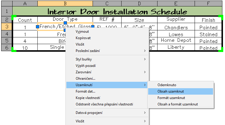Datové buňky jsou ve výchozím nastavení uzamčeny, aby se zabránilo nechtěným změnám. Obsah buněk lze upravovat po jejich ručním odemknutí. Je-li tabulka aktualizována, lze vybrat, zda chcete upravené buňky přepsat, nebo zda chcete buňky aktualizovat nebo neaktualizovat.