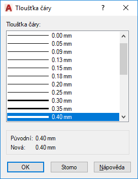 Zobrazuje dostupné tloušťky čar. Dostupné tloušťky čar obsahují pevné tloušťky, které jsou běžně používány ve výkresech. Vybráním tloušťky čáry ji použijete.