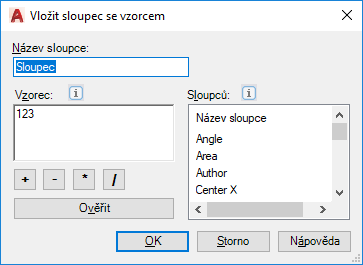 Zobrazí názvy sloupců z extrahovaných dat výkresu a externích dat (pokud bylo vytvořeno propojení). Názvy sloupců je možné dvojitým kliknutím přidat do pole Vzorec nebo přetáhnout ze seznamu Sloupec do pole Vzorec. Existující sloupce s názvy nejsou v seznamu uvedeny a nelze je použít jako hodnoty pro vytvoření dalších sloupců se vzorci.