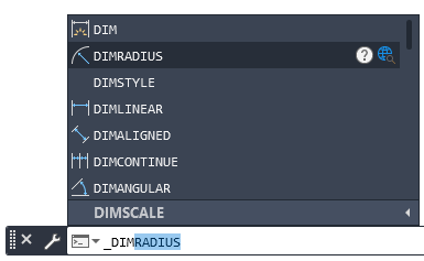 Pokud začnete psát název příkazu nebo systémové proměnné na příkazovém řádku, funkce automatického dokončování zobrazí možnosti volby. Pokud například zadáte kóty, zobrazí se všechny příkazy a systémové proměnné, které začínají těmito znaky, jak je znázorněno na ukázce.