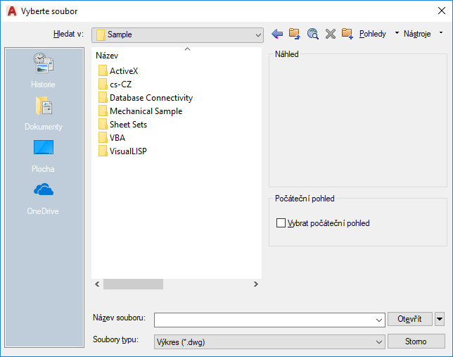 Zobrazuje náhled vybraného souboru. Chcete-li uložit obrázek (bitmapu) se souborem výkresu, použijte možnost Uložit obrázek náhledu na kartě Otevřít a Uložit v dialogu Možnosti.