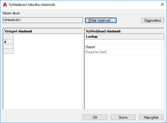 Vyhledávací tabulka přiřadí hodnoty uživatelských vlastností k referenci dynamického bloku. Pokud je pro vyhledávací vlastnost vybrána možnost Zpětné vyhledávání, reference bloku zobrazí vyhledávací uzel se seznamem vlastností, které mění zobrazení reference dynamického bloku.