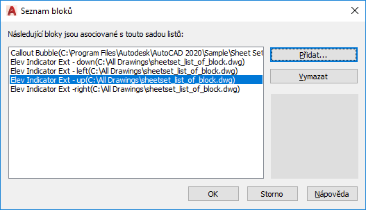 Můžete zde zobrazit seznam, přidat nebo odstranit odkazovací bloky pro použití v aktuální sadě listů.