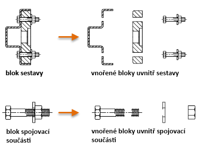Lze vytvořit výkresové soubory pro vložení do jiných výkresů jako bloky. Jednotlivé výkresové soubory se snadno vytvářejí a spravují jako zdroj definic bloků. Související výkres je možné uložit do složky jako knihovnu bloků.