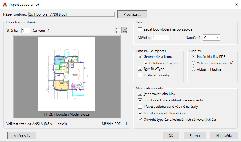 Vytvoří se hladiny aplikace AutoCAD z hladin uložených v souboru PDF a použijí se na importované objekty. Názvy hladin mají předponu PDF. Hladina objektu se vytvoří v případě, že se žádná hladina nenachází v souboru PDF.