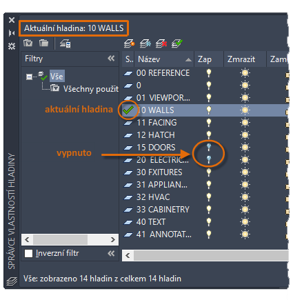 Jak je vidět na obrázku, hladina 10 STĚNY je aktuální hladina. Všechny nové objekty budou automaticky umístěny do této hladiny. V seznamu hladin zelené zaškrtnutí vedle hladiny 10 STĚNY potvrzuje, že se jedná o aktuální hladinu.
