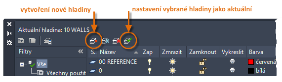 Chcete-li vytvořit novou hladinu, klikněte na zobrazené tlačítko a zadejte název nové hladiny. Pokud chcete nastavit jako aktuální jinou hladinu, klikněte na ni a potom klikněte na označené tlačítko.