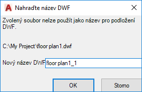 Názvy připojovaných referencí DWF nebo DWFx musí být jedinečné. Při pokusu o připojení dvou referencí DWF nebo DWFx se stejným názvem se zobrazí dialog Nahraďte název DWF.