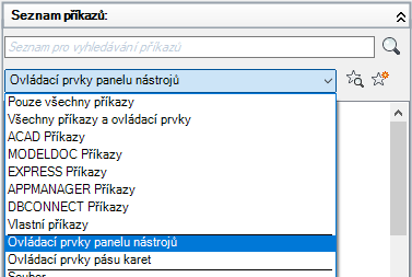 V podokně Seznam příkazů se zobrazí pouze seznam ovládacích prvků pásu karet.