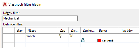 Zobrazí vlastnosti hladin, jež určují, které hladiny jsou uvedeny v seznamu. Chcete-li definovat filtr, můžete kliknutím zadat jednu nebo více vlastností. Aby se zobrazil název hladiny, musí být splněny všechny vlastnosti uvedené na jednom řádku v definici filtru (logické AND). Každý následující řádek v definici filtru určuje alternativní kritéria (logické OR).