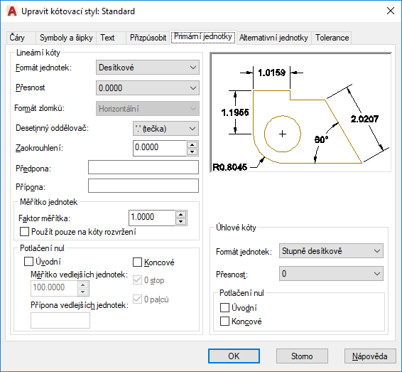 Nastavuje formát a přesnost primárních kótovacích jednotek a nastavuje předpony a přípony kótovacího textu.