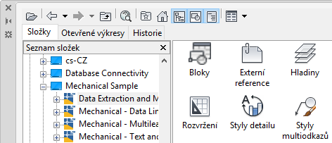 Stromové zobrazení v levé části okna DesignCenter vám společně s kartami DesignCenter pomůže najít a načíst obsah do oblasti obsahu.