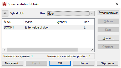 V seznamu atributů se zobrazí atributy vybraného bloku. Implicitně se v seznamu atributů zobrazují vlastnosti atributů: Štítek, Výzva, Výchozí, Režim a Popisný. Popis pod seznamem atributů zobrazuje počet instancí v aktuálním výkresu a v aktuálním rozvržení každého vybraného bloku.