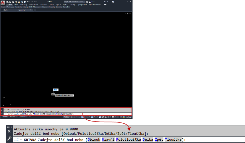). Pokud skryjete příkazové okno, můžete nadále zadávat příkazy v popisku tlačítek dynamického zadání. Některé příkazy a systémové proměnné vrací v příkazovém okně hodnotu a v těchto případech si můžete toto okno znovu zobrazit.