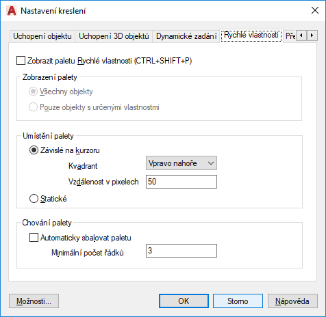 Nastavuje zobrazení palety Rychlé vlastnosti. Další informace viz Přizpůsobení panelu Rychlé vlastnosti.