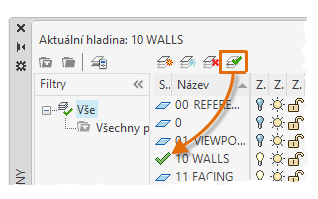 Všechny nové objekty jsou při kreslení standardně vkládány do aktuální hladiny. Zelená značka zatržení ve Správci vlastností hladiny označuje aktuální hladinu.