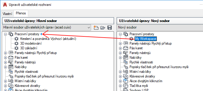 V podokně Uživatelské úpravy <název souboru> (vpravo) přetáhněte pracovní prostor ze souboru CUIx do uzlu Pracovní prostor hlavního souboru CUIx v podokně Uživatelské úpravy <název souboru> (vlevo).