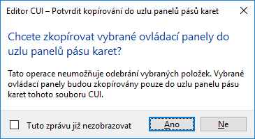 - V dialogovém okně Editor CUI – Potvrdit zkopírování do uzlu panelů pásu karet klikněte na možnost Ano.